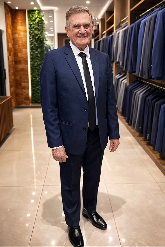 Terno clássico em tecido Oxford com modelagem semi-slim na cor azul, oferecendo um visual moderno sem abrir mão do conforto. Sua textura elegante e caimento sofisticado são perfeitos para qualquer ocasião formal.